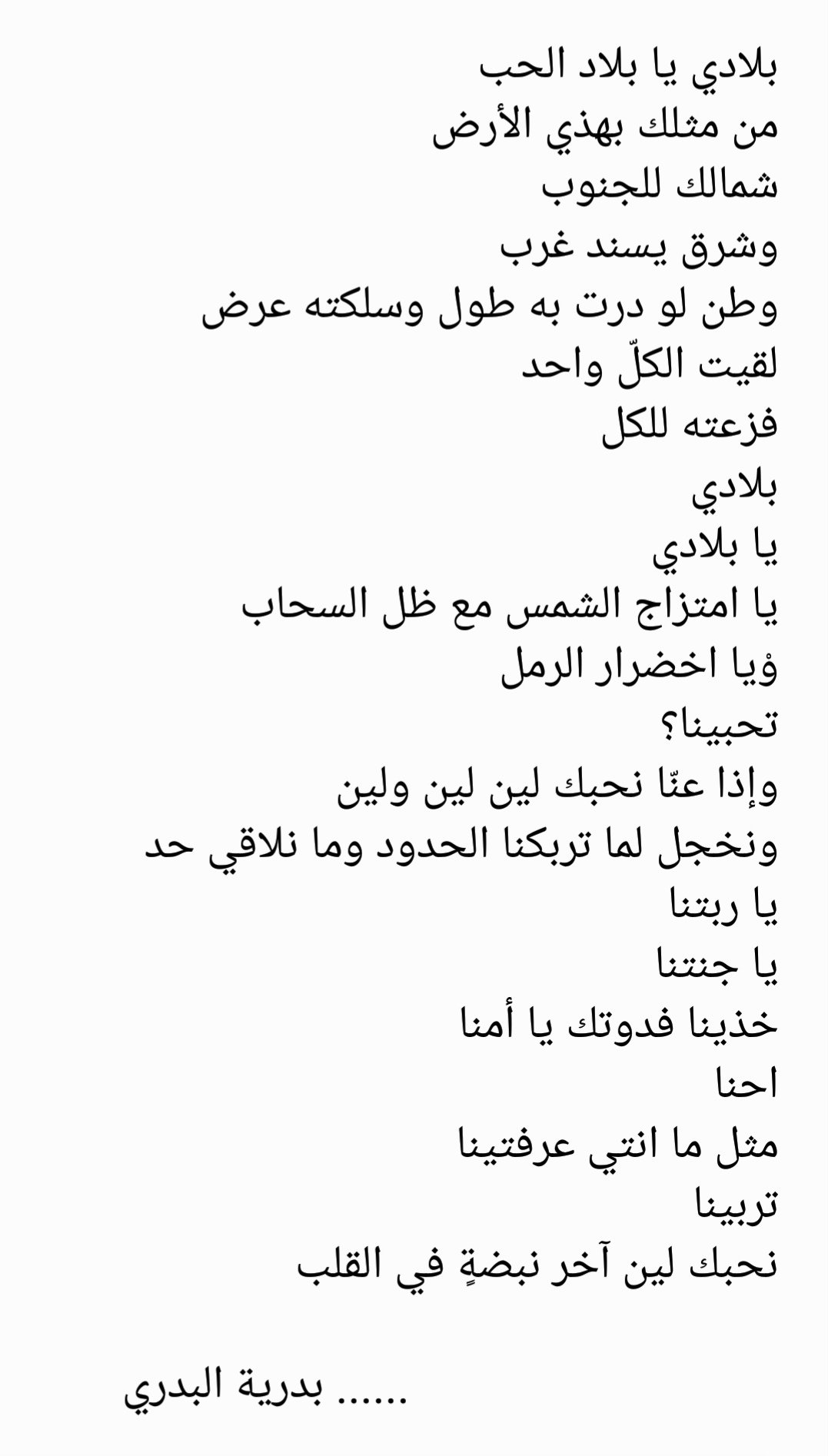 بدرية البدري No Twitter بلادي يابلاد الحب من مثلك بهذي الأرض شمالك للجنوب وشرق يسند غرب وطن لو درت به طول وسلكته عرض لقيت الكل واحد فزعته للكل بلادي يابلادي ياامتزاج الشمس