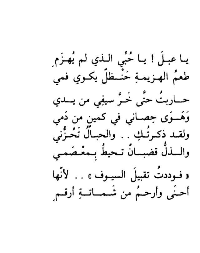 ولقد ذكرتك والرماح نواهل من ي وبيض الهند تقطر من دمي فو ددت تقبيل السيوف لأنها لمعت كبارق ثغرك المتبس م عنترة بن شداد Arabic Art Calligraphy Arabic Words