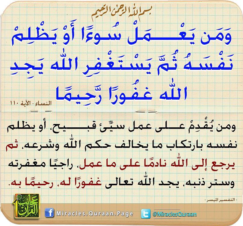 ومن يعمل سوءا أو يظلم نفسه ثم يستغفر الله يجد الله غفورا رحيما 110 ومن يكسب إثما فإنما يكسبه على نفسه وكان الله عليما حكيما 111 ومن يكسب خطيئة أو إثما ثم يرم به بريئا فقد احتمل بهتانا وإثما مبينا 112 ولولا فضل الله عليك.