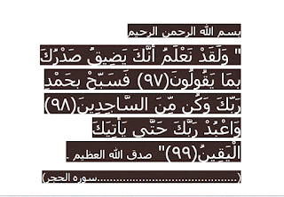 You إذا ضــــــاق صـــــدرك عليــــك بثـــــلاث ولقـــد نـعلـــم أن ـك يـضيـــق صـدرك بـما يـقولــون فس بـــح بحمـــد رب ك وكـــن م ن الساجديـــن وأعبــــد رب ـك حتى يـأتيــك الـيقين يـضيق صــدرك وتسمع ما لاتـطيـق سماعـــــه